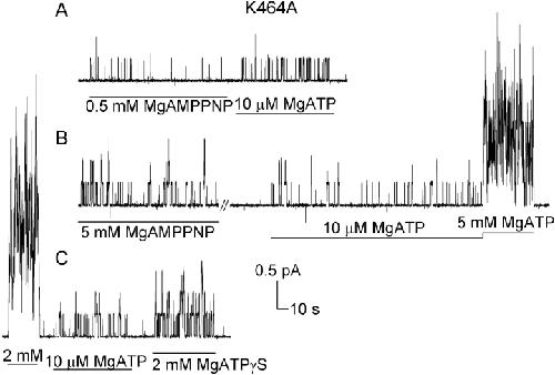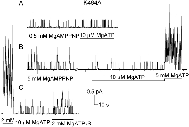 Figure 11. . Gating of prephosphorylated K464A channels by poorly hydrolyzable ATP analogs, as indicated. Unlike WT (Fig. 7 A), K464A burst duration was not increased during exposure to MgAMPPNP (A and B, τb = 270 ± 50 ms, n = 8), and was only slightly increased during exposure to ATPγS (C, τb = 655 ± 170 ms, n = 8), compared with bursts in MgATP (τb = 276 ± 21 ms, n = 16) in the same patches. Note that, due to the lower apparent affinity of K464A for MgATP (Fig. 2), the relative opening rate of mutant channels at 10 μM MgATP averaged only 2.3 ± 0.8% (n = 3) of that in saturating MgATP (compared with ∼11% for WT), so the opening rate of K464A channels was similar in the presence of millimolar concentrations of the poorly hydrolyzable analogs or of 10 μM MgATP.