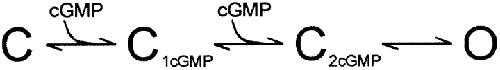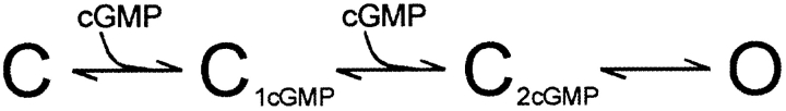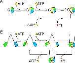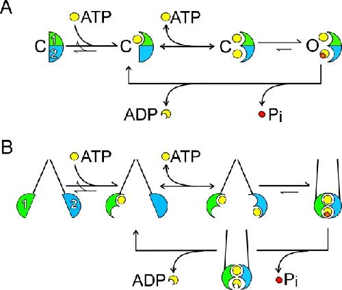 Figure 12. . (A) Simplified scheme illustrating proposed linking of steps in WT CFTR channel gating, and nucleotide binding and hydrolytic cycles. Yellow ovals depict MgATP complexes, smaller red oval is inorganic phosphate, Pi (colored orange in prehydrolysis complex on open channel); the CFTR protein is represented as a green (NBD1) and blue (NBD2) semicircle, with shape altered (signifying induced-fit conformational changes in the NBDs; Karpowich et al., 2001) upon nucleotide binding. “C” represents closed interburst states of the channel and “O” symbolizes the collection of states during open bursts. Thickness and length of arrows indicate relative rates of individual steps. There is no evidence for strict sequential binding of the two MgATP complexes, but the alternative pathway to the doubly occupied closed state, in which nucleotide binds first at NBD2, probably occurs infrequently in WT CFTR (though not necessarily in mutants) and so was omitted for clarity. (B) Cartoon illustrating a possible physical interpretation of the scheme in A, in which NBD dimerization couples ATP binding and hydrolysis at the catalytic sites to opening and closing of the channel pore. Two semicircles represent NBD1 (green) and NBD2 (blue), and the transmembrane domains are represented by straight-line segments connected to the NBDs. Closed and Open channels are indicated by converging or near-parallel transmembrane domains, respectively. Catalytic sites and Cl− permeation pathway are structurally connected such that NBD dimer formation results in opening of the channel pore.