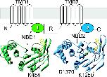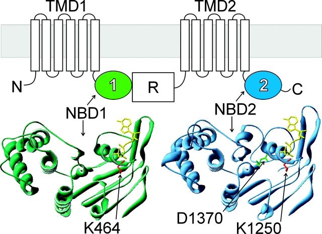 Figure 1. . (Top) Cartoon of CFTR's domain topology, comprising two transmembrane domains (TMDs), a regulatory (R) domain, and NBD1 (green) and NBD2 (blue). (Below) Ribbon representations of homology models of NBD1 (green) and NBD2 (blue), based on the crystal structure of HisP-ATP (Hung et al., 1998), showing exposed positions of ATP molecules (yellow), Walker A lysines (red), and NBD2 Walker B aspartate (green). Homology models were built using the automated comparative modeling server “Swiss-model” (http://www.expasy.ch/swissmod/SWISS-MODEL.html; Guex and Peitsch, 1997) with alignments optimized on the basis of a ClustalW multiple sequence alignment of 20 bacterial and human NBDs.