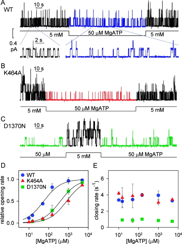 Figure 2. . [MgATP] dependence of rates of opening to, and closing from, a burst of WT and mutant CFTR channels in inside-out patches. (A) WT channels, prephosphorylated by 300 nM PKA and 5 mM MgATP, shown during exposure to 5 mM, then 50 μM, and again 5 mM MgATP, as indicated; expanded segments at 5 mM and 50 μM MgATP are shown below. (B and C) Representative traces for prephosphorylated K464A and D1370N channels. Relative opening (D) and closing (E) rates (mean ± SEM, 2 ≤ n ≤ 7) from analysis of records as in A–C for WT (blue circles), K464A (red triangles), and D1370N (green squares) channels at 10 μM ≤ [MgATP] ≤ 5 mM, plotted on semilogarithmic axes. Opening rate and closing rate at each test [MgATP] were normalized to the mean values measured for bracketing segments at 5 mM MgATP (procedure (b), materials and methods). Curves in D show Michaelis-Menten fits, yielding K0.5 of 56 ± 5, 807 ± 185, 391 ± 118 μM, and rCOmax of 1.02, 1.16, and 1.08, for WT, K464A, and D1370N, respectively. For display, the data were further normalized to these rCOmax values. Mean absolute opening rates at 5 mM MgATP are given in Table I B. In E, the measured relative closing rates at each [MgATP] have been multiplied by the mean absolute closing rate for each construct in 5 mM MgATP (Table I B).