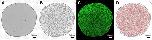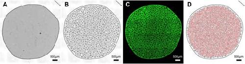 Figure 1. Representative images of protocell pattern formation in an extract droplet. (A,B) Representative brightfield images of an extract droplet before (A) and after (B) protocell formation. (C) Fluorescence imaging reveals that inert dextran molecules accumulate in boundary zones between protocells. (D) A Voronoi tessellation captures the essential geometry of the protocell pattern. Images were taken at 7 min (A) and 175 min (B-D) after chamber loading. See Movie 1 for the droplet's temporal evolution.
