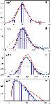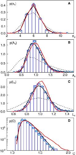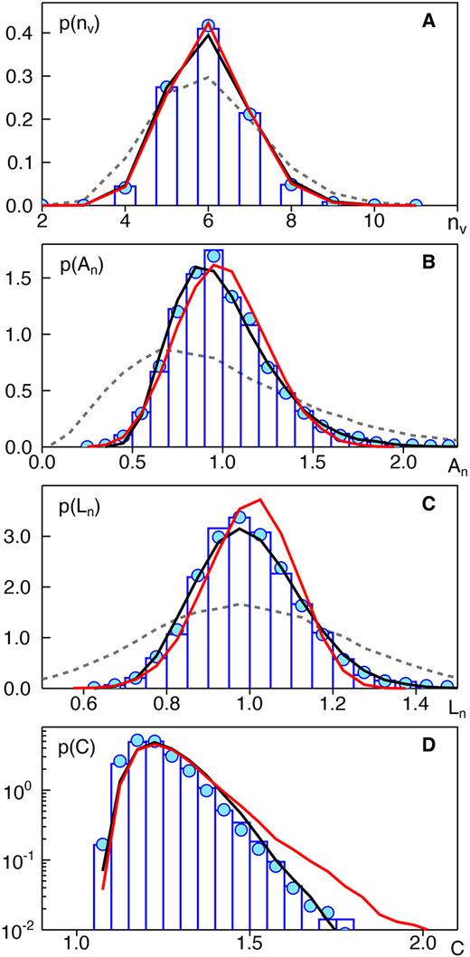 Figure 2. Analysis of geometrical features of protocells. (A) The PDF of the vertex number, p(nv), of protocells right after the first emergence of the pattern (blue histogram) and 1-2 h later (blue circles) is highly similar. Hexagonal cells are the most frequent phenotype, followed by appreciable amounts of pentagons and heptagons. The experimental data are well captured by model 1 (α1=0.55, black line) and model 2 (α2=0.45, red line), whereas a PRP pattern (gray dashed line) features marked deviations. All models are sketched in Fig. 6 and are defined in the main text. (B,C) The PDFs of normalized cell areas, p(An), and cell perimeters, p(Ln), feature narrow shapes and show similar characteristics (color-coded as in A). Both models match the experimental data for early and late stages of the pattern, and the result for PRP patterns is markedly different. (D) The PDF of protocell compactness, p(C), with features a mean 〈C〉≈1.24 that is larger than the value for circles (C=1) and hexagons () but lower than that for squares (C=4/π); color-coded as in A. The experimental data are well captured by model 1 (α1=0.55, black line) and slightly less well by model 2 (α2=0.45, red line). Please note the semilogarithmic plot style.