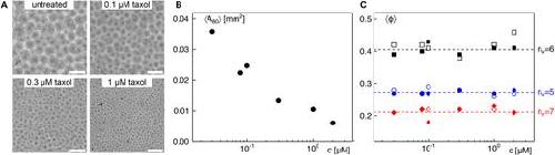 Figure 3. Taxol addition leads to smaller protocells but does not alter the pattern geometry. (A) Representative images of protocell patterns obtained from extracts that have been supplemented with the indicated concentration of taxol. Scale bars: 100 μm. A marked reduction of protocell sizes for increasing taxol concentrations is visible. For better visibility, the image contrast has been adjusted here; all evaluations were performed on unaltered images. (B) The average protocell area 〈A80〉, found 70-90 min after starting the experiment, decreases for increasing taxol concentrations, c. (C) The average fraction 〈φ〉 of pentagonal, hexagonal and heptagonal protocells (blue circles, black squares and red diamonds, respectively) is almost constant for all taxol concentrations, c, irrespective of the time after the pattern emerged (unfilled and filled symbols represent immediately after pattern emergence and 1-2 h later, respectively). In addition, geometric measures such as those shown in Fig. 2 remained unaltered (compare with Fig. S5A,B).