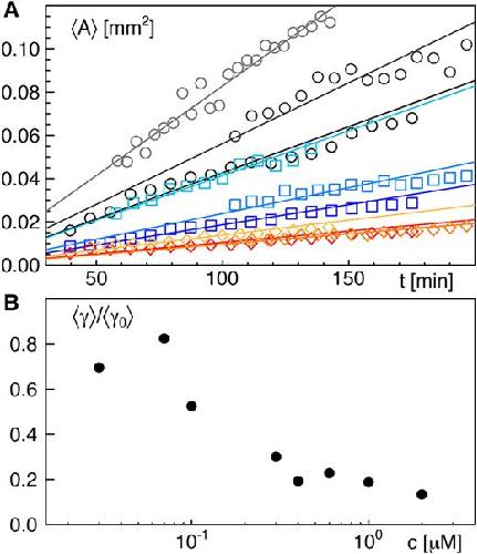 Figure 4. Dynamic evolution of protocell patterns. (A) Representative time courses of the average protocell area, 〈A〉, for different taxol concentrations (circles, squares, diamonds for , respectively; different colors indicate different repeats of the assay). All are well captured by a linear growth, 〈A〉=γt, with varying growth rates γ (solid lines). (B) The mean area growth rate 〈γ〉 decreases with increasing taxol concentrations, c, dropping down to about 15-20% of the rate observed for untreated extracts, 〈γ0〉, at .