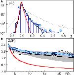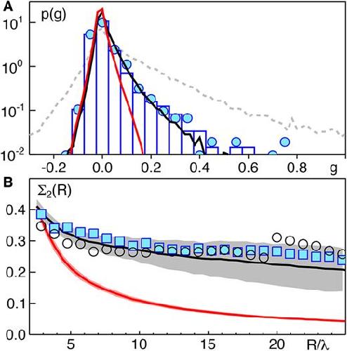Figure 5. Long-range organization of protocell patterns. (A) The PDF of NN area correlation values (Eqn 1), peaks sharply around zero for the experimental data immediately after the emergence of the protocell pattern (blue histogram) and after 1-2 h of coarse graining (blue circles). Whereas model 1 captures the experimental PDF almost perfectly (black line), model 2 decays too steeply for g>0 (red line); the PDF for PRP patterns (gray dashed line) is far too broad. (B) The normalized number variance, Σ2, as a function of the rescaled test radius, R/λ, converges to a small but non-zero constant for the array of protocells (blue squares and black circles represent time points immediately after pattern emergence and 1-2 h later, respectively). This indicates that the pattern displays no disordered hyperuniformity. Whereas model 1 matches the experimental data well (black line) the hyperuniform characteristics of model 2 (red line) is clearly inconsistent with the experiment. Gray and red shaded areas indicate the standard deviation for different realizations of the point patterns in the respective model.