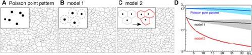 Figure 6. Generic models used for comparison with experimental data. (A-C) Voronoi tessellation for a PRP pattern (A), model 1 with α=0.55 (B) and model 2 with α=0.45 (C). Insets visualize the rules for creating the pattern of center points (see main text for details). Black dots indicate cell centers, red outlines represent perturbed hexagonal cell shapes. (D) The corresponding normalized number variances, Σ2, (shown in a semilogarithmic style) reveal that model 1 approaches a small but non-zero constant, whereas model 2 shows the typical feature of a disordered hyperuniform pattern, i.e. a decrease of Σ2 towards zero; the PRP pattern shows the anticipated behavior, Σ2≈1. Shaded areas indicate the standard deviation for different realizations of the point patterns.