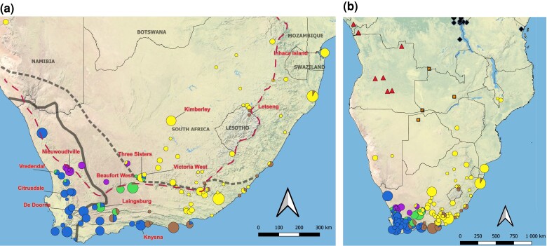 Fig. 2. Geographical distribution of X. laevis sampling localities in (a) southern Africa used for RRGS (red labels) and Sanger sequencing of mitochondria (circular pies) and (b) sub-Saharan Africa with circles, triangles, squares, and diamonds for X. laevis, X. petersii, X. poweri, and X. victorianus, respectively). For X. laevis, colors correspond to mitochondrial clades in Fig. 5. In (a), solid and dotted lines indicate the margins of the winter rainfall zone to the southwest and the summer rainfall to the northeast, respectively (Chase and Meadows 2007) and a red dashed line indicates the Great Escarpment (see main text). The locality of the X. gilli sample, not shown, falls within the range of the winter rainfall (blue) clade of X. laevis, and is listed in Supplementary Table 2.