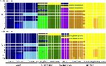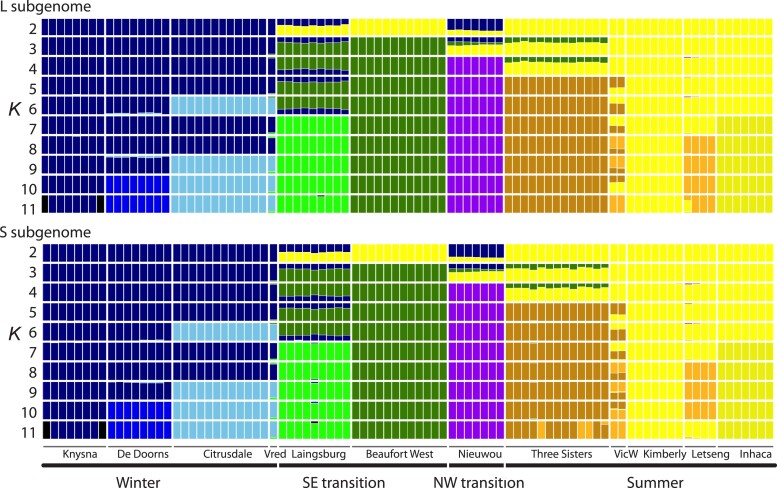 Fig. 4. Admixture plot using only the L subgenome (top) or only the S subgenome (bottom) for 2–11 ancestry components (K) labeled on the left side. The order of the samples is from left to right matches the order of samples in Supplementary Table 1.