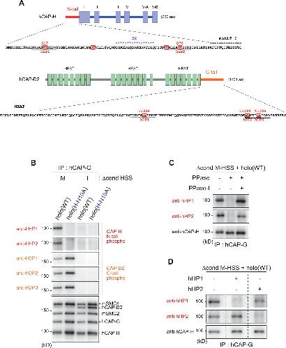 Figure 2—figure supplement 1 Mitosis-specific phosphorylation of condensinI subunits. (A) Schematic diagrams of hCAP-H and hCAP-D2. The hCAP-H N-tail has four SP/TP sites whereas the hCAP-D2 C-tail has three TP sites. Peptide sequences used to prepare phospho-specific antibodies are underlined (hHP1 and hHP2 for hCAP-H; hDP1, hDP2, and hDP3 for hCAP-D2). (B) Detection of phosphoepitopes in Xenopus egg extracts. Holo(WT) or holo(H-N19A) was added to Δcond M-HSS or I-HSS at a final concentration of 35 nM and incubated at 22°C for 150 min. The condensin complexes were immunoprecipitated and analyzed by immunoblotting using the antibodies indicated. (C) Phosphatase treatment of the recombinant condensin I complex. Holo(WT) was preincubated with Δcond M-HSS and immunoprecipitated as described in (B). Bead-bound fractions were treated with λ protein phosphatase (PPase) in the presence or absence of phosphatase inhibitors (PPase-I) and analyzed by immunoblotting using the antibodies indicated. (D) Phophopeptide competition assay. Holo(WT) was preincubated with Δcond M-HSS, immunoprecipitated and subjected to immunoblotting as described in (B). The membranes were triplicated and probed with anti-hHP1 in the presence of no competing peptide, hHP1 or hHP2. Another set of triplicated membranes was probed with anti-hHP2 in the presence of no competing peptide, hHP1 or hHP2. |