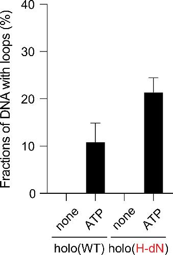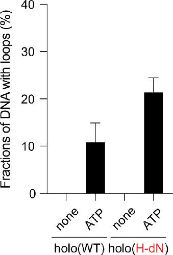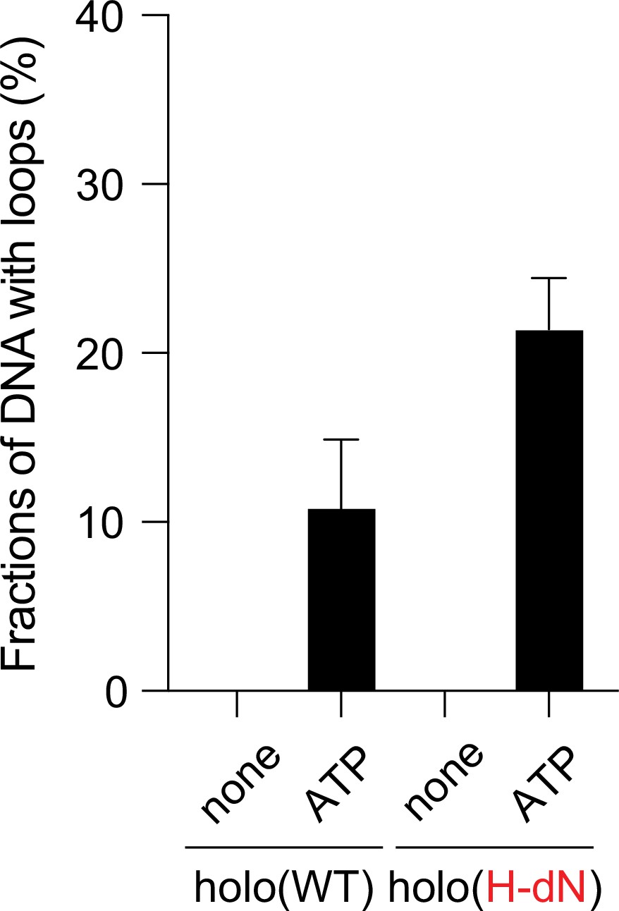 Figure 4—figure supplement 1 ATP dependency of the loop extrusion activities. Frequency of DNA loop formation by holo(WT) or holo(H-dN) in the presence or absence of ATP (n = 3; ≥57 DNAs per condition). The error bars represent mean ± standard error of the mean (SEM). No loop formation was observed in the absence of ATP in either case. |