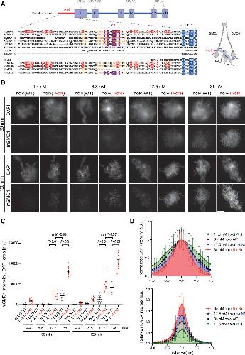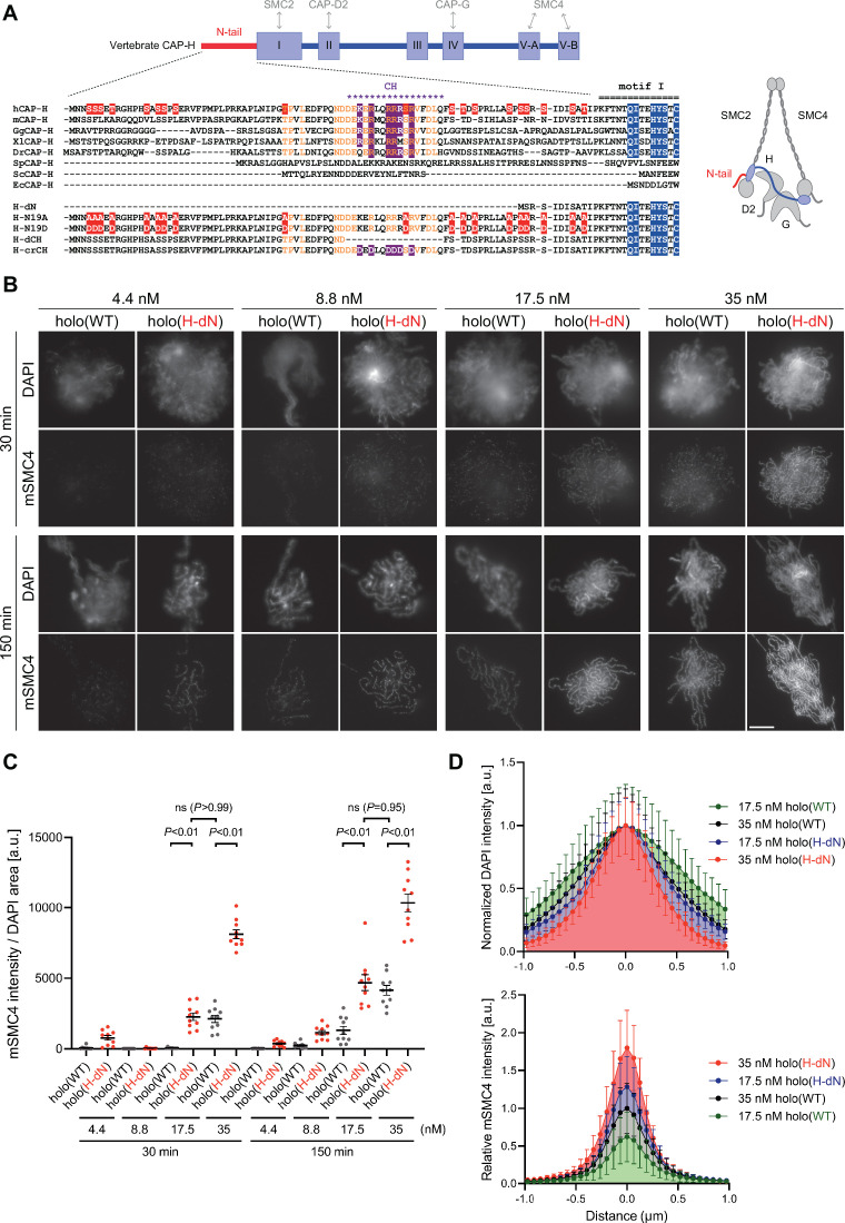 Figure 1. Deletion of the CAP-H N-tail accelerates condensin I loading and mitotic chromosome assembly.(A) Domain organization of vertebrate CAP-H and sequence alignments of the CAP-H N-tail in eukaryotes (left). Shown in the upper half is an alignment of the CAP-H orthologs (Homo sapiens: hCAP-H, Mus musculus: mCAP-H, Gallus gallus: GgCAP-H, Xenopus laevis: XlCAP-H, Danio rerio: DrCAP-H, Schizosaccharomyces pombe: SpCAP-H, Saccharomyces cerevisiae: ScCAP-H, and Encephalitozoon cuniculi: EcCAP-H). Six mutants tested in the current study (H-dN, H-N19A, H-N19D, H-dCH, and H-crCH) are shown in the bottom half. Conserved amino-acid residues were shown in yellow (N-tail) or blue (motif I). The helix motif predicted using Jpred4 (http://www.compbio.dundee.ac.uk/jpred/) is indicated by ‘CH’ (for the conserved helix). The N19A/N19D and crCH mutation sites were shown in red and purple, respectively. Also shown in a schematic diagram of the architecture of vertebrate condensin I (right). (B) Add-back assay with holo(WT) and holo(H-dN). Mouse sperm nuclei were incubated with condensin-depleted M-HSS that had been supplemented with holo(WT) or holo(H-dN) at concentrations of 4.4, 8.8, 17.5, and 35 nM. After 30 and 150 min, the reaction mixtures were fixed and processed for immunofluorescence labeling with an antibody against mSMC4. DNA was counterstained with DAPI. Shown here is a representative image from over 10 chromosome clusters examined per condition. Scale bar, 10 μm. (C) Quantification of the intensity of mSMC4 per DNA area in the experiment shown in (B) (n = 10 clusters of chromosomes). The error bars represent the mean ± standard error of the mean (SEM). The p values were assessed by Tukey’s multiple comparison test after obtaining a significant difference with two-way analysis of variance (ANOVA). (D) Line profiles of mitotic chromosomes observed at 150 min shown in the experiment shown in (B). Signal intensities of DAPI (top) and mSMC4 (bottom) from chromosomes assembled by holo(WT) or holo(H-dN) at 17.5 or 35 nM were measured along with the lines drawn perpendicular to chromosome axes (n = 20). The mean and standard deviation (SD) were normalized individually to the DAPI intensities (arbitrary unit [a.u.]) at the center of chromosome axes (distance = 0 μm) (top). Intensities of mSMC4 signals were normalized relative to the value from holo(WT) at 35 nM (bottom). The error bars represent the mean ± SD. Figure 1—source data 1. Microsoft excel of non-normalized data corresponding to Figure 1C.Figure 1—source data 2. Microsoft excel of non-normalized data corresponding to Figure 1D. |