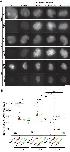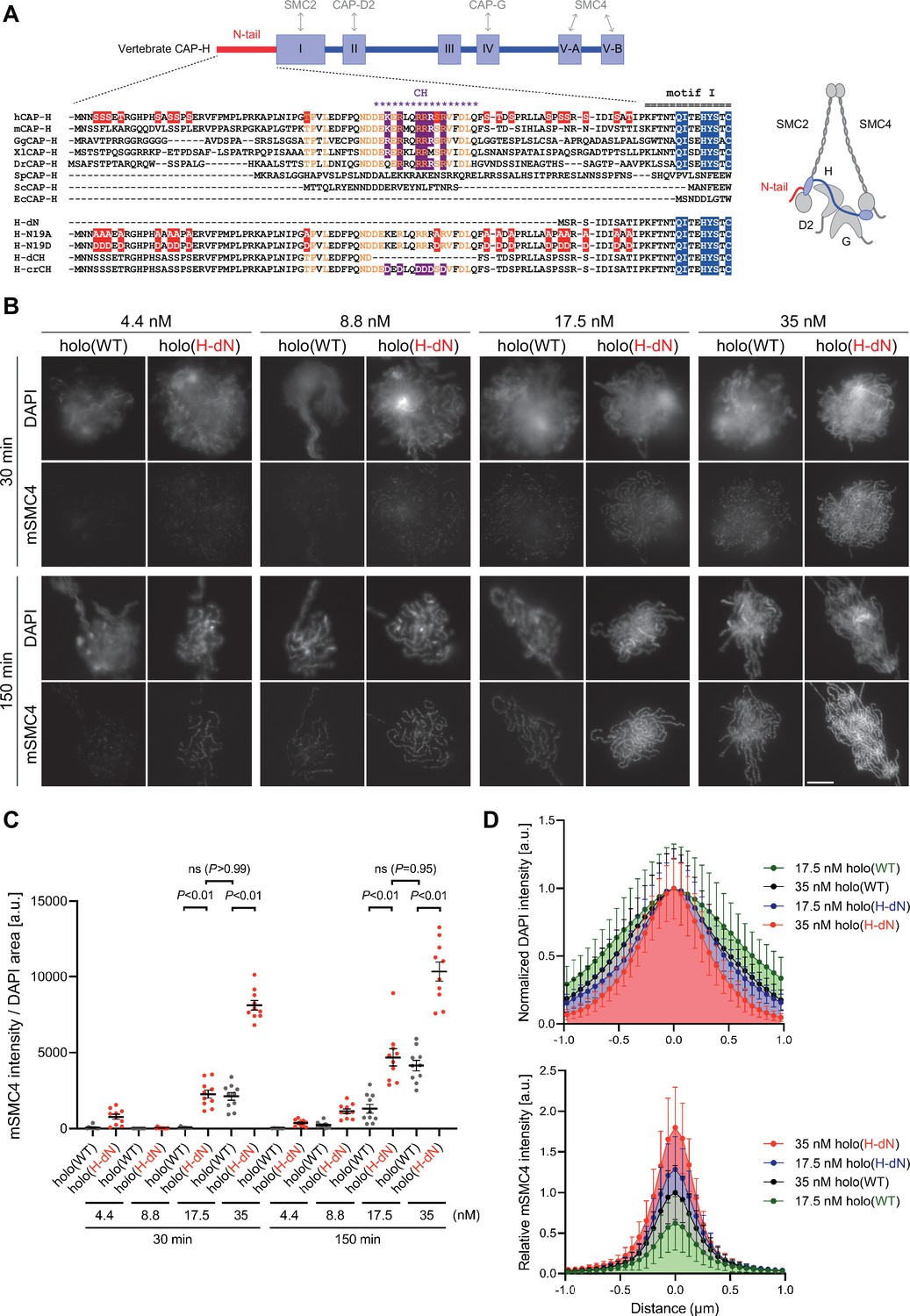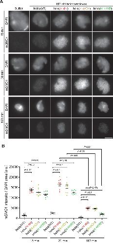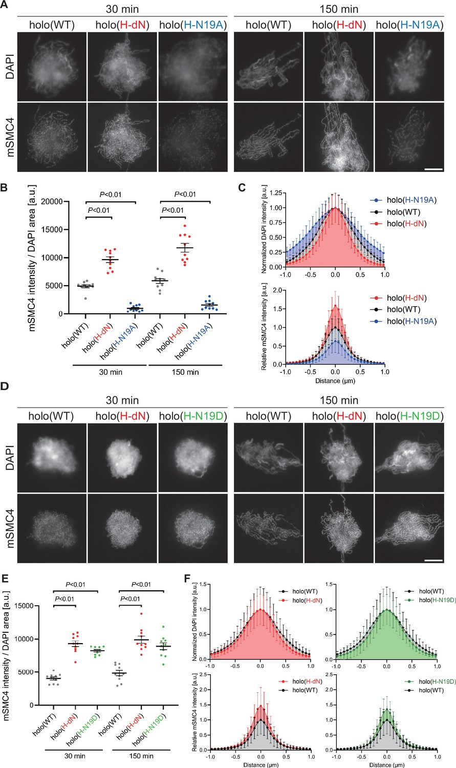 Figure 2 Phosphorylation-deficient and phosphorylation-mimetic mutations of the CAP-H N-tail decelerate and accelerate condensin I loading, respectively. (A) Mouse sperm nuclei were incubated with condensin-depleted M-HSS that had been supplemented with holo(WT), holo(H-dN), or holo(H-N19A) at a final concentration of 35 nM. After 30 and 150 min, the reaction mixtures were fixed and processed for immunofluorescence labeling with an antibody against mSMC4. DNA was counterstained with DAPI. Shown here is a representative image from over 10 chromosome clusters examined per condition. Scale bar, 10 μm. (B) Quantification of the intensity of mSMC4 per the DAPI area in the experiment shown in (A) (n = 10 clusters of chromosomes). The error bars represent the mean ± standard error of the mean (SEM). The p values were assessed by Tukey’s multiple comparison test after obtaining a significant difference with one-way analysis of variance (ANOVA) at each time point. A dataset from a single representative experiment out of more than three repeats is shown. (C) Line profiles of mitotic chromosomes observed at 150 min in the experiment shown in (A). Signal intensities of DAPI (top) and mSMC4 (bottom) of the chromosomes assembled with holo(WT) (black), holo(H-dN) (red), or holo(H-N19A) (blue) were measured along with the lines drawn perpendicular to chromosome axes (n = 20). The mean and standard deviation were normalized individually to the DAPI intensities (arbitrary unit [a.u.]) at the center of chromosome axes (distance = 0 μm) within each set. Intensities of mSMC4 signals from holo(H-dN) and holo(H-N19A) were normalized relative to the value from holo(WT). A dataset from a single representative experiment out of more than three repeats is shown. (D) Add-back assay using holo(WT), holo(H-dN), and holo(H-N19D) at a final concentration of 35 nM was performed as described in (A). Shown here is a representative image from over 10 chromosome clusters examined per condition. Scale bar, 10 μm. (E) Quantification of the intensity of mSMC4 per the DAPI area in the experiment shown in (D) (n = 10 clusters of chromosomes). The error bars represent the mean ± SEM. The p values were assessed by Tukey’s multiple comparison test after obtaining a significant difference with one-way ANOVA at each time point. A dataset from a single representative experiment out of more than three repeats for holo(WT) and holo(H-dN) and two repeats for holo(H-N19D) is shown. (F) Line profiles of mitotic chromosomes assembled observed at 150 min in the experiment shown in (D). The signal intensities of DAPI (top) and mSMC4 (bottom) of the chromosomes assembled with holo(WT) (black), holo(H-dN) (red), or holo(H-N19D) (green) were measured and plotted as described in (C) (n = 20). A dataset from a single representative experiment out of more than three repeats for holo(WT) and holo(H-dN) and two repeats for holo(H-N19D) is shown. |