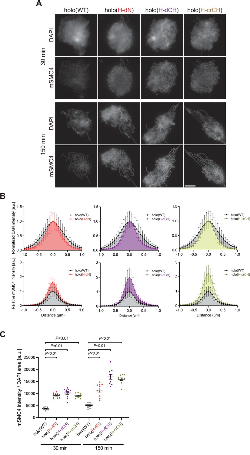 Figure 1 Deletion of and mutations in the conserved helix accelerates condensin I loading and mitotic chromosome assembly. (A) Mouse sperm nuclei were incubated with condensin-depleted M-HSS that had been supplemented with holo(WT), holo(H-dN) holo(H-dCH), or holo(H-crCH) at a final concentration of 35 nM. After 30 and 150 min, the reaction mixtures were fixed and processed for immunofluorescence labeling with an antibody against mSMC4. DNA was counterstained with DAPI. Shown here is a representative image from over 10 chromosome clusters examined per condition. Scale bar, 10 μm. (B) Line profiles of mitotic chromosomes observed at 150 min in the experiment shown in (A). Signal intensities of DAPI (top) and mSMC4 (bottom) from the chromosomes assembled with holo(WT) (black), holo(H-dN) (red), holo(H-dCH) (purple), or holo(H-crCH) (yellow) were measured along with the lines drawn perpendicular to chromosome axes (n = 20). The error bars represent the mean ± standard deviation (SD). The mean and SD were normalized individually to the DAPI intensities (arbitrary unit [a.u.]) at the center of chromosome axes (distance = 0 μm) within each set. Intensities of mSMC4 signals from holo(H-dN), holo(H-dCH), and holo(H-crCH) were normalized relative to the value from holo(WT). A dataset from a single representative experiment out of two repeats is shown. (C) Quantification of the intensity of mSMC4 per DNA area in the experiment shown in (A) (n = 10 clusters of chromosomes). The error bars represent the mean ± standard error of the mean (SEM). The p values were assessed by Tukey’s multiple comparison test after obtaining a significant difference with one-way analysis of variance (ANOVA) at each time point. A dataset from a single representative experiment out of two repeats is shown. |