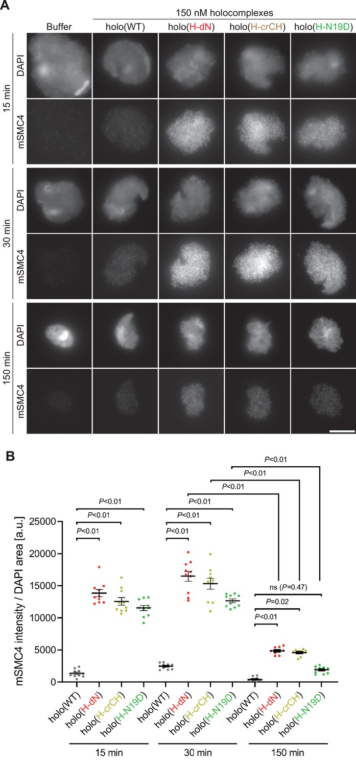 Figure 3—figure supplement 1 Deletion of and mutations in the conserved helix enables condensin I to assemble mitotic chromosome-like structures even in interphase extracts. (A) Mouse sperm nuclei were incubated with condensin-depleted I-HSS that had been supplemented with holo(WT), holo(H-dN), holo(H-crCH), or holo(H-N19D) at a final concentration of 150 nM. After 15, 30, and 150 min, the reaction mixtures were fixed and processed for immunofluorescence labeling with an antibody against mSMC4. DNA was counterstained with DAPI. Shown here is a representative image from over 10 chromosome clusters examined per condition. Scale bar, 10 μm. (B) Quantification of the intensity of mSMC4 per DAPI area in the experiment shown in (A) (n = 10 clusters of chromosomes). The error bars represent the mean ± standard error of the mean (SEM). The p values were assessed by Tukey’s multiple comparison test after obtaining a significant difference with two-way analysis of variance (ANOVA). |