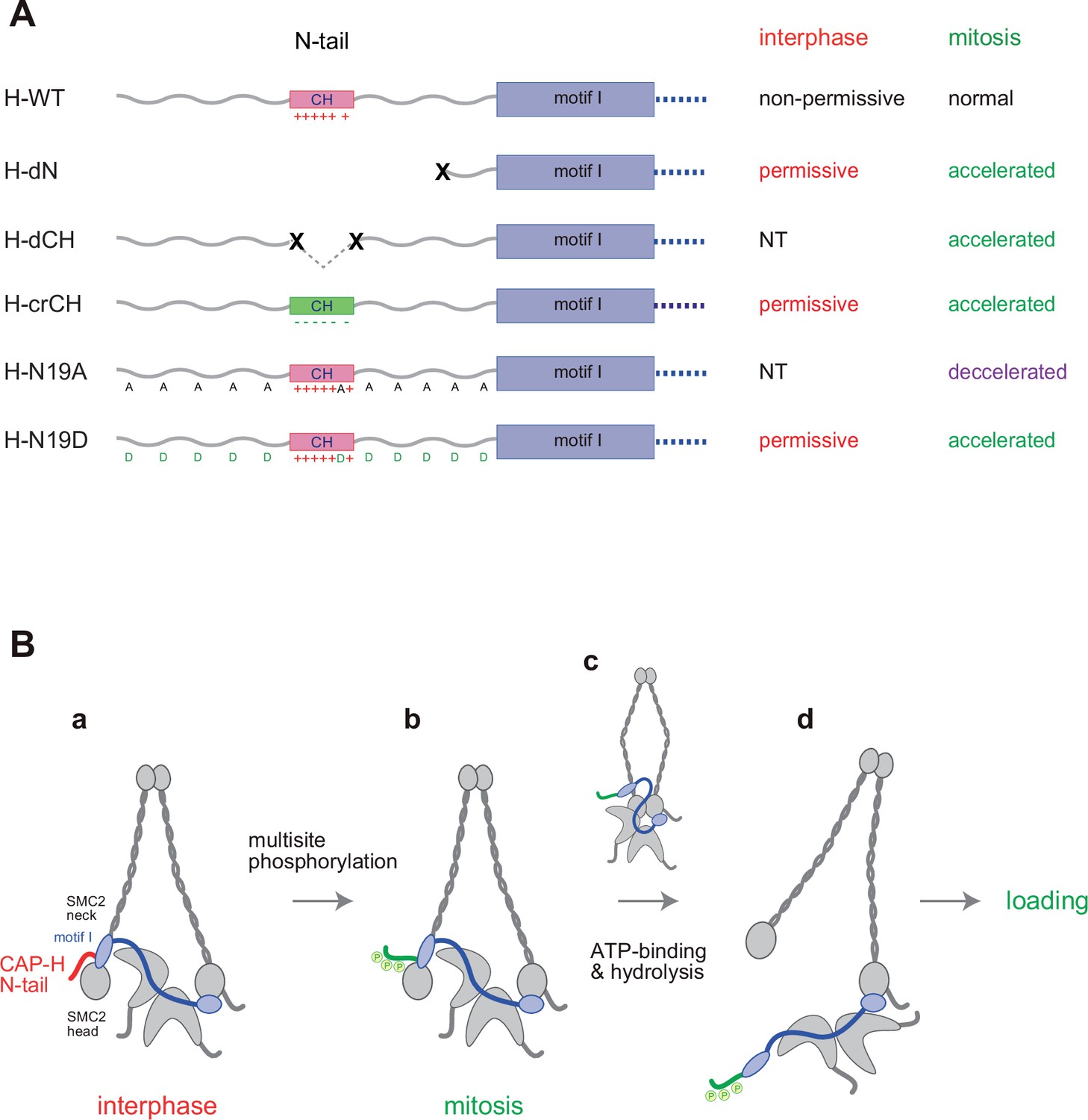 Figure 5. Regulation of condensin I by the N-tail of its kleisin subunit.(A) Summary of the mutant complexes tested in the current study. NT: not tested. (B) Model of cell cycle regulation of condensin I loading. The SMC2-kleisin gate is closed when the CAP-H motif I binds to the SMC2 neck (a). In our model, this binding is stabilized by the CAP-H N-tail, thereby preventing its untimely opening during interphase. The conserved helix located in the middle of the N-tail contributes to this stabilization, possibly through direct interaction with the SMC2 head or neck. Upon mitotic entry, multisite phosphorylation of the N-tail relaxes this stabilization (b). ATP binding and hydrolysis by the SMC subunits trigger the opening of the DNA entry gate, thereby enabling condensin I to load onto chromosomes (c, d). Thus, the kleisin N-tail of vertebrate condensin I could act as a ‘gatekeeper’ of the SMC2-kleisin gate. |