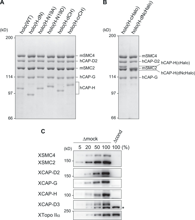 Figure 1—figure supplement 1 Recombinant condensin I complexes and immunodepletion. (A) The wild-type and mutant condensin I complexes used in the current study. The recombinant complexes were purified from insect cells and subjected to sodium dodecyl sulfate–polyacrylamide gel electrophoresis (SDS–PAGE). The gel was stained with Coomassie brilliant blue (CBB). (B) HaloTag–condensin I complexes used in the loop extrusion assay. The recombinant complexes were purified from insect cells and subjected to SDS–PAGE before being fluorescently labeled. The gel was stained with CBB. (C) Immunodepletion of endogenous condensins from Xenopus egg M-HSS. Endogenous condensin subunits were depleted from the M-HSS using Dynabeads Protein A coupled with control IgG (Δmock) or a mixture of antibodies against the subunits of condensins I and II (Δcond). To estimate the efficiency of depletion, the Δcond extract (100%) was compared with different amounts of the Δmock extract (5%, 20%, 50%, and 100%) by immunoblotting using the antibodies indicated. Endogenous topo IIα (XTopo IIα) was used as a loading control. The asterisk indicates a non-specific band. |
