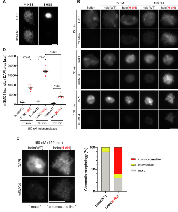 Figure 3 Deletion of the CAP-H N-tail enables condensin I to assemble mitotic chromosome-like structures even in interphase extracts. (A) Mouse sperm nuclei were incubated with M-HSS (left) and I-HSS (right) for 150 min, and the reaction mixtures were fixed and processed for immunofluorescence labeling with an antibody against XSMC2 (bottom). DNA was counterstained with DAPI (top). Scale bar, 10 μm. (B) Mouse sperm nuclei were incubated with condensin-depleted I-HSS that had been supplemented with a control buffer, holo(WT), or holo(H-dN) at a final concentration of 35 or 150 nM. After 15, 30, and 150 min, the reaction mixtures were fixed and processed for immunofluorescence labeling with an antibody against mSMC4. DNA was counterstained with DAPI. Shown here is a representative image from over 10 chromosome clusters examined per condition. Scale bar, 10 μm. (C) Blow-up images of a chromatin ‘mass’ assembled with 150 nM holo(WT) at 150 min and a cluster of mitotic ‘chromosome-like’ structures assembled with 150 nM holo(H-dN) at 150 min in the experiment shown in (B). Frequencies of the chromosomal phenotypes observed under the two conditions, which include ‘intermediate’ structures, are plotted on the right (n = 10 for each condition). Scale bar, 10 μm. (D) Quantification of mSMC4 intensities on interphase chromatin when added holo(WT) or holo(H-dN) at 150 nM. The graph shows the intensity of mSMC4 per the DAPI area (n = 10 masses of chromatin) shown in (B). The error bars represent the mean ± standard error of the mean (SEM). The p values were assessed by Tukey’s multiple comparison test after obtaining a significant difference with two-way analysis of variance (ANOVA). A dataset from a single representative experiment out of three repeats is shown. Another set of the reproduced result was also shown in Figure 3—figure supplement 1. |