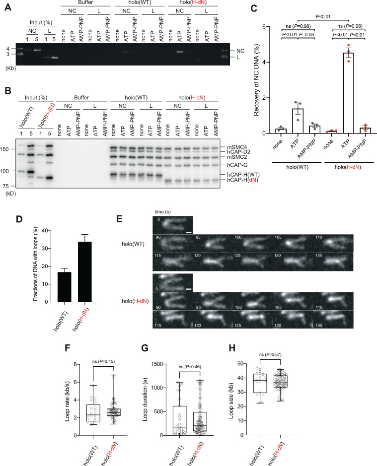 Figure 4 Deletion of the CAP-H N-tail enhances topological loading onto circular DNA and increases the frequency of loop formation in vitro. (A–C) Topological loading assay. (A) Loading reactions onto nicked circular DNA (NC) or linearized DNA (L) were set up with a control buffer, holo(WT) or holo(H-dN) in the absence of nucleotides (none) or the presence of ATP or AMP-PNP. DNAs recovered on beads after a high-salt wash were analyzed by agarose gel electrophoresis. (B) Confirmation of the efficiency of immunoprecipitation in the experiment shown in (A). Using the one-tenth volume of the recovered samples, immunoblotting analysis was performed with the antibodies indicated. (C) Quantification of the recovery of NC DNA in the experiments shown in (A). The error bars represent the mean ± standard error of the mean (SEM) from three independent experiments. The p values were assessed by Tukey’s multiple comparison test after obtaining a significant difference with two-way analysis of variance (ANOVA). (D–H) Loop extrusion assay. The error bars represent mean ± SEM. The p values shown in (F)–(H) were assessed by a two-tailed Mann–Whitney U-test. (D) Frequency of DNA loop formation by holo(WT) or holo(H-dN) (n = 3, ≥53 DNAs per condition). (E) Time-lapse images of DNA loop extrusion events by holo(WT) and holo(H-dN). DNA was stained with Sytox Orange. Scale bar, 1 μm. (F) Loop extrusion rate by holo(WT) or holo(H-dN) in the same experiment as in (E) (from three independent experiments, n = 21 and 59 for holo(WT) and holo(H-dN), respectively). (G) Duration time to maintain DNA loops by holo(WT) or holo(H-dN) in the same experiment as in (E) (from three independent experiments, n = 27 and 81 for holo(WT) and holo(H-dN), respectively). (H) Loop size produced by holo(WT) or holo(H-dN) in the same experiment as in (E) (from three independent experiments, n = 21 and 59 for holo(WT) and holo(H-dN), respectively). |