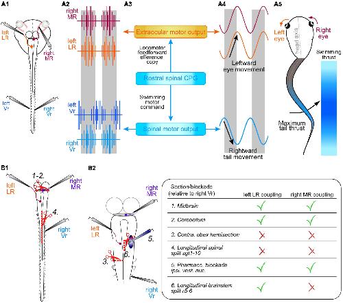 Figure 2. Semi-intact preparation of Xenopus larvae for studying the influence of spinal motor network ECs in gaze stabilization during fictive locomotion. (A1–5) Schematic of a head-brainstem-spinal cord preparation (A1) depicting recordings (A2) of a left and right spinal ventral root (Vr, blue traces), a synergistic left lateral rectus (LR, orange trace) and a right medial rectus (MR, red trace) extraocular motor nerve; direct spino-ocular motor connectivity (A3) conveys a copy of swimming motor output from the spinal CPG circuitry to drive compensatory conjugate eye movements during head movements resulting from propulsive bending (A4), mainly of the mid-tail region [indicated by color intensity grading in panel (A5)]. (B1,2) Schematics of the isolated central nervous system (B1) illustrating various surgical lesions and drug application interventions that allowed identifying the ascending pathway from the spinal CPG circuitry to bilateral synergistic sets of LR and MR extraocular motoneurons; 1, 2, disconnection of the midbrain [1 in panel (B1)] and cerebellum [2 in panel (B1)]; 3, hemisection of the brainstem/spinal cord at the level of the obex on the side ipsilateral to a recorded (left) LR nerve (B2) whose burst activity occurred in phase with Vr bursts on the opposite (right) cord side; 4, longitudinal midline split throughout the first 10 spinal segments (B1); 5, injection of glutamatergic transmitter antagonists (CNQX + KYNA) into the vestibular nucleus to block central processing of sensory endorgan signals (B2); 6, midline incision at the level of the abducens nucleus in rhombomere 5 (B2). These interventions and their respective effects on spino-ocular motor coupling to the synergistic left LR and right MR nerves are summarized in the table at right.