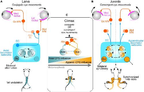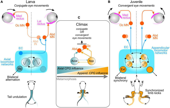 Figure 3. Neuronal pathways underlying spino-ocular motor coupling during swimming in pre- and post-metamorphic Xenopus. (A) Schematic depicting the spinal CPG for tail-based propulsion in larvae and pathway connections that convey spinal EC signals to the extraocular motor system; after crossing the spinal cord, ascending projections from the spinal axial CPG network directly drive abducens motoneurons (Abd MN) innervating the lateral rectus (LR) eye muscle on the opposite side and indirectly via abducens internuclear neurons (Abd IN) drive oculomotor motoneurons (Oc MN) innervating the synergistic medial rectus (MR) eye muscle on the same side; this spino-ocular connectivity produces conjugate eye movements during swimming. (B) Schematic depicting the spinal CPG for limb-based rectilinear forward propulsion in juvenile Xenopus and pathway connections with the extraocular motor system; ascending, uncrossed projections from the spinal appendicular locomotor network activate ipsilateral Abd MNs and Oc MNs to produce convergent eye movements during each hindlimb extensor-driven kick cycle. (C) During metamorphic climax, larval and adult CPG circuits co-exist and can be conjointly active, producing a combination of tail- and limb-based propulsion and corresponding EC signals that continuously elicit appropriate conjugate and convergent eye movements; the influence of the appendicular system on ocular motor control progressively increases as the impact of the axial system declines as limb-based locomotion emerges, co-exists with, and eventually replaces tail-based locomotion during metamorphosis (schematized at bottom).