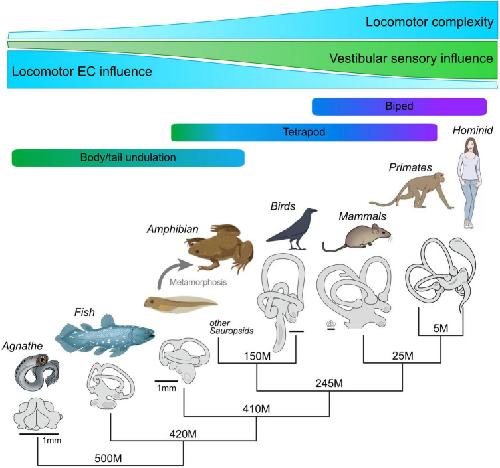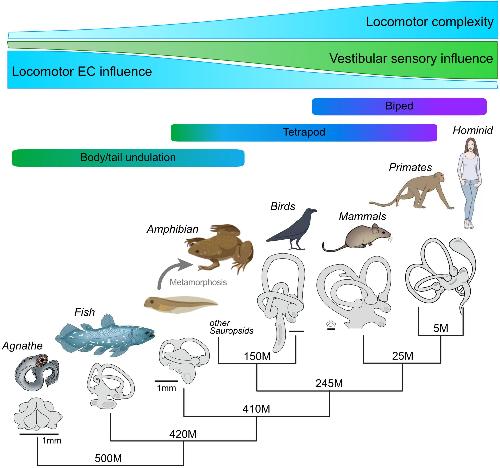 Figure 6. Hypothetical evolutionary development of locomotor complexity in vertebrates, the accompanying increase in morphological complexity and the role played by vestibular sensory signaling, and the resultant gradual decline in locomotor EC influence in the production of compensatory eye movements. Despite the increasing capability of inner ear endorgans for motion detection and sensory-motor transformations, locomotor EC signals appear to have maintained an important role in gaze stabilization, even during bipedal locomotion.