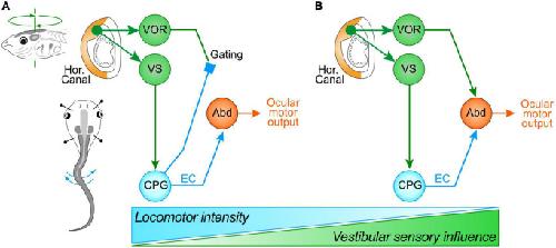 Figure 4. Differential swim intensity-dependent interactions between vestibular sensory signals and locomotor ECs. (A) Schematic depicting the gating of vestibulo-ocular signaling during intense swimming in older larvae or in rapidly-swimming young larvae, leading to ocular motor performance remaining coordinated with tail undulations exclusively through an ascending drive from spinal ECs; during less intense or slow swimming (B), ocular motor performance results from an additive relationship between the predictive ECs and horizontal semicircular canal signals, with the latter now contributing significantly to compensatory eye motion; the two processing configurations gradually change their respective dominance depending on swimming strength and frequency (bottom schematic). Abd, abducens motoneurons; CPG, central pattern generator; VOR, vestibulo-ocular reflex; VS, vestibulo-spinal pathway.