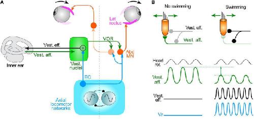 Figure 5. Attenuation of mechanosensory signal encoding in the inner ear during locomotor activity in larval Xenopus. (A) Summary schematic of the circuit elements mediating the vestibulo-ocular reflex (VOR), spino-ocular motor coupling and activation of inner ear vestibular efferent neurons (Vest. eff.) by locomotor ECs. (B) Influence of locomotor activity conveyed by Vest. eff. onto hair cells and vestibular afferent neurons (Vest. aff.); during swimming (right), the overall responsiveness of vest. aff. (magnitude of the sine wave) to imposed cyclic head rotation is substantially reduced compared to the condition without swimming (left). Abd MN, abducens motoneurons; Vr, spinal ventral root.