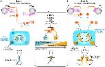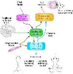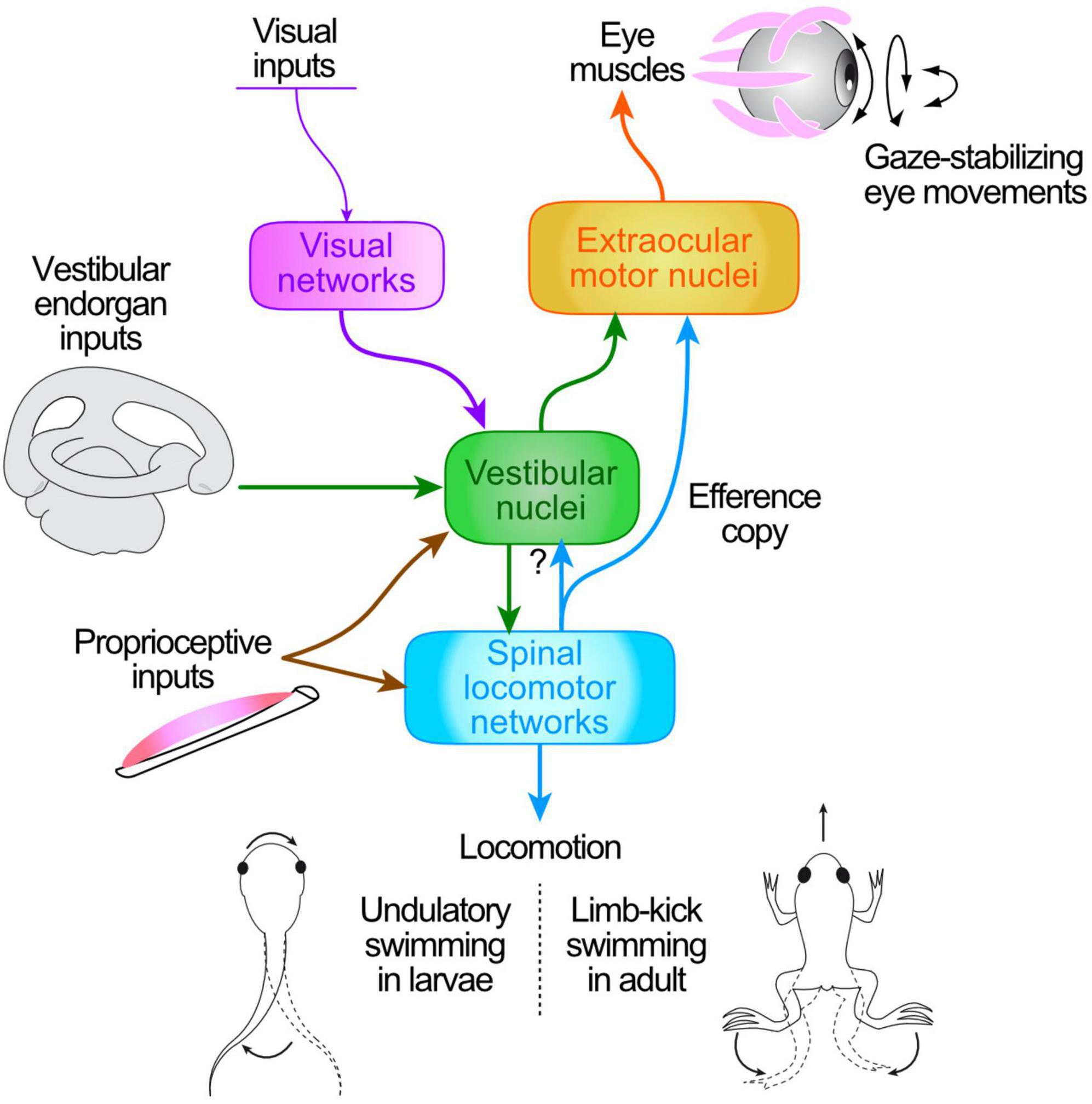 Figure 1. Schematic of central pathways responsible for the transformation of head/body motion-related sensory signals (from visual motion, vestibular endorgans, neck proprioceptors) and ascending motor efference copies (ECs) from spinal locomotor CPG networks into ocular motor commands for gaze stabilization during tail undulatory swimming in Xenopus larvae (bottom left) and limb-kicking propulsion in adults (bottom right).