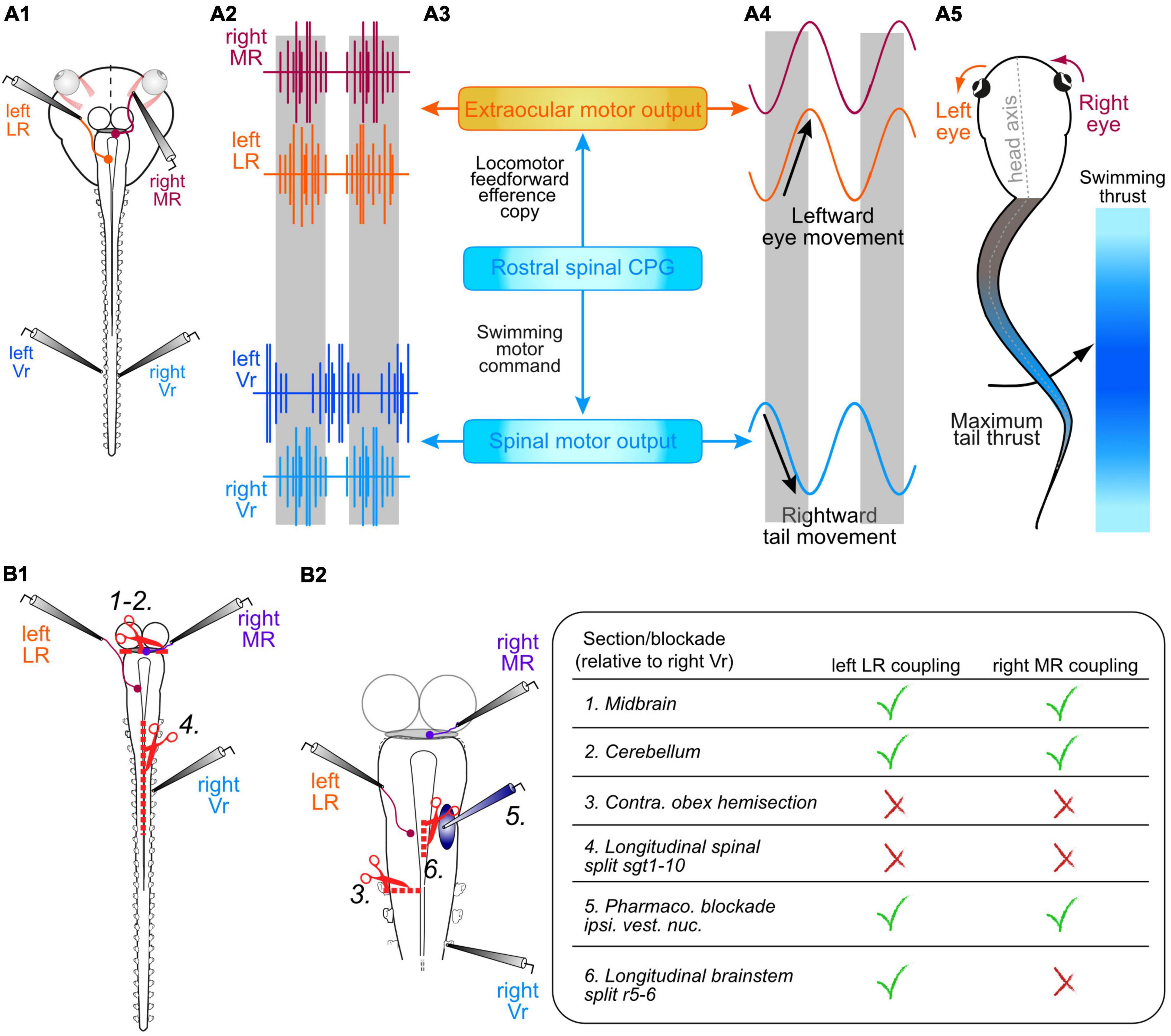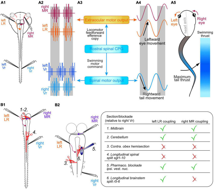 FIGURE 2. Semi-intact preparation of Xenopus larvae for studying the influence of spinal motor network ECs in gaze stabilization during fictive locomotion. (A1–5) Schematic of a head-brainstem-spinal cord preparation (A1) depicting recordings (A2) of a left and right spinal ventral root (Vr, blue traces), a synergistic left lateral rectus (LR, orange trace) and a right medial rectus (MR, red trace) extraocular motor nerve; direct spino-ocular motor connectivity (A3) conveys a copy of swimming motor output from the spinal CPG circuitry to drive compensatory conjugate eye movements during head movements resulting from propulsive bending (A4), mainly of the mid-tail region [indicated by color intensity grading in panel (A5)]. (B1,2) Schematics of the isolated central nervous system (B1) illustrating various surgical lesions and drug application interventions that allowed identifying the ascending pathway from the spinal CPG circuitry to bilateral synergistic sets of LR and MR extraocular motoneurons; 1, 2, disconnection of the midbrain [1 in panel (B1)] and cerebellum [2 in panel (B1)]; 3, hemisection of the brainstem/spinal cord at the level of the obex on the side ipsilateral to a recorded (left) LR nerve (B2) whose burst activity occurred in phase with Vr bursts on the opposite (right) cord side; 4, longitudinal midline split throughout the first 10 spinal segments (B1); 5, injection of glutamatergic transmitter antagonists (CNQX + KYNA) into the vestibular nucleus to block central processing of sensory endorgan signals (B2); 6, midline incision at the level of the abducens nucleus in rhombomere 5 (B2). These interventions and their respective effects on spino-ocular motor coupling to the synergistic left LR and right MR nerves are summarized in the table at right.