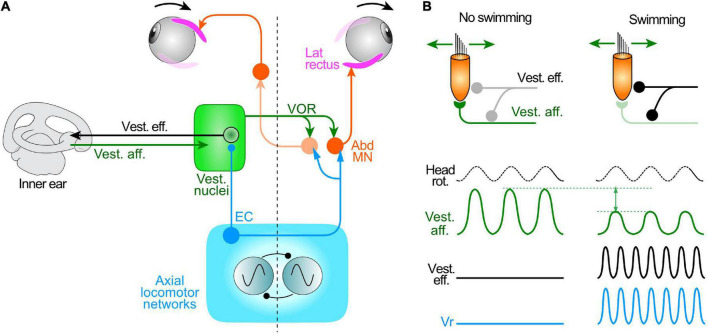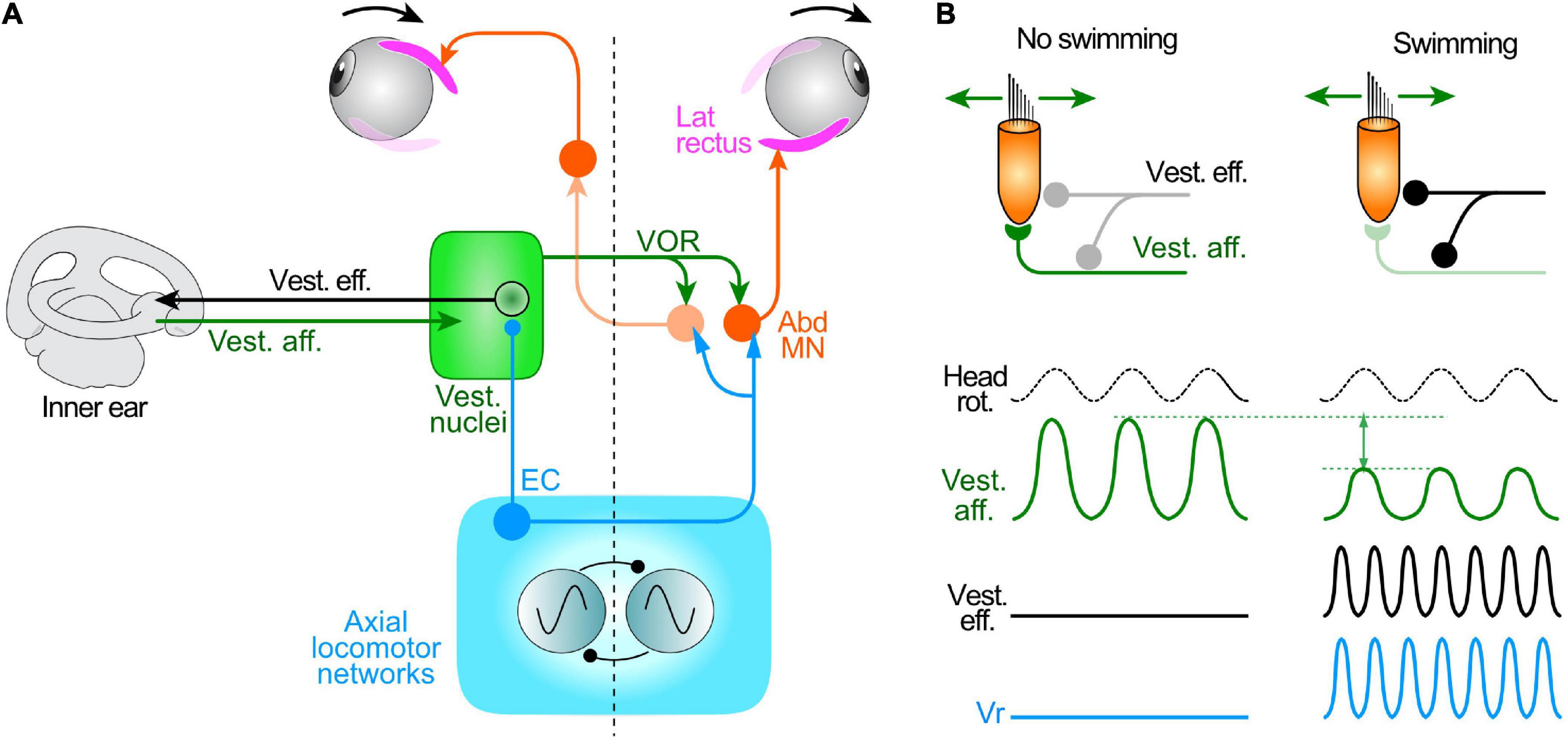 FIGURE 5. Attenuation of mechanosensory signal encoding in the inner ear during locomotor activity in larval Xenopus. (A) Summary schematic of the circuit elements mediating the vestibulo-ocular reflex (VOR), spino-ocular motor coupling and activation of inner ear vestibular efferent neurons (Vest. eff.) by locomotor ECs. (B) Influence of locomotor activity conveyed by Vest. eff. onto hair cells and vestibular afferent neurons (Vest. aff.); during swimming (right), the overall responsiveness of vest. aff. (magnitude of the sine wave) to imposed cyclic head rotation is substantially reduced compared to the condition without swimming (left). Abd MN, abducens motoneurons; Vr, spinal ventral root.