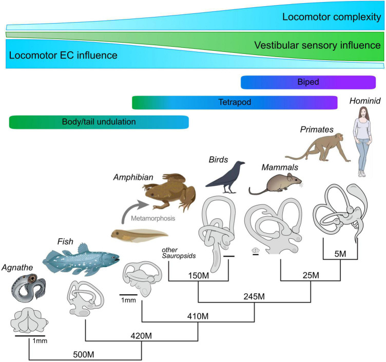 FIGURE 6. Hypothetical evolutionary development of locomotor complexity in vertebrates, the accompanying increase in morphological complexity and the role played by vestibular sensory signaling, and the resultant gradual decline in locomotor EC influence in the production of compensatory eye movements. Despite the increasing capability of inner ear endorgans for motion detection and sensory-motor transformations, locomotor EC signals appear to have maintained an important role in gaze stabilization, even during bipedal locomotion.