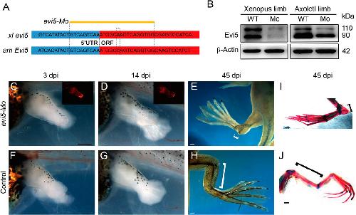 FIGURE 2. Effect of evi5 Mo on limb development of Xenopus. (A) Design of evi5 Mo against Xenopus evi5 (xl evi5) and axolotl Evi5 (am Evi5). Open reading frame indicated in red, targeted region of evi5 Mo shown in yellow. (B) Detection of Evi5 protein by Western blotting, in Xenopus and axolotl limb stump after injection and electroporation of evi5 Mo. Anti-Evi5 (ab 70790) was used for Evi5 protein. Beta-Actin used as loading control. (CH) Knockdown of Evi5 expression during limb development. The Mo-injected limbs (CE) showed significant developmental delay compared with the control group (FH), and developmental abnormalities were observed at late developmental stages (white brackets indicate the length of the zeugopods). (I,J) Skeletal staining of hindlimbs at late developmental stages, with red indicating bone tissue and blue indicating cartilage tissue. Black brackets indicate zeugopods. Scale bars represent 500 m in (C,D,F,G) and 1 mm in (E,H) and (I,J).