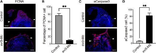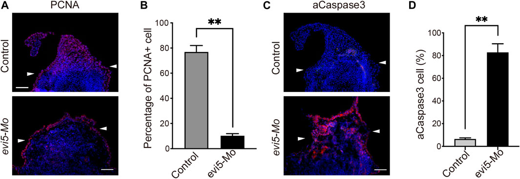 FIGURE 4. Proliferation and apoptosis of Xenopus tadpole limb blastema after Evi5 knockdown. (A) Immunofluorescence staining of PCNA (red) in evi5 Mo-injected NF stage 52 tadpole hind limbs at 3 dpa. Nuclei were counterstained with DAPI, shown in blue. (B) Quantitative analysis of PCNA-positive cells in the limb stump mesenchyme, distal to the level marked by white arrowheads. ** indicates significant difference, p <0.01, n = 3, t-test. (C) Immunofluorescence staining of active Caspase3 (aCaspase3, shown in red) in evi5 Mo-injected NF stage 52 tadpole hind limbs at 3 dpa. (D) Quantitative analysis of aCaspase3-positive cells in the limb stump distal to the level marked by white arrowheads. ** indicates significant difference, p <0.01, n = 3, t-test. Scale bars represent 100 m.