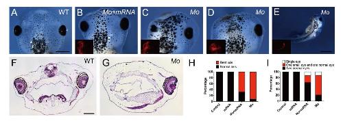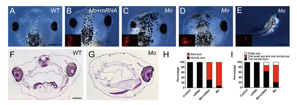 Figure S2. Effect of evi5 Mo on embryonic development of Xenopus. (A-E) Knockdown of Evi5 expression during embryonic development, resulting in a smaller eye on the injected side (C) and even an eyeless phenotype (D). Co-injection of evi5 Mo with evi5 mRNA partially rescues the abnormal eye development (B). Injection of evi5 Mo also causes body axis bending (E). (F, G) HE staining of wild-type tadpoles (F) and Moinjected tadpoles (G). (H, I) Statistics of body axis bending phenotype and small eye phenotype in each