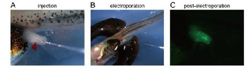 Figure S3. Injection and electroporation method. (A) Injection of Mo into the hind limb of NF stage 52 tadpoles using a pulled glass micropipette. (B) Tweezer-style electrodes placed on both sides of the limb for electroporation. (C) Fluorescence detection after electroporation.