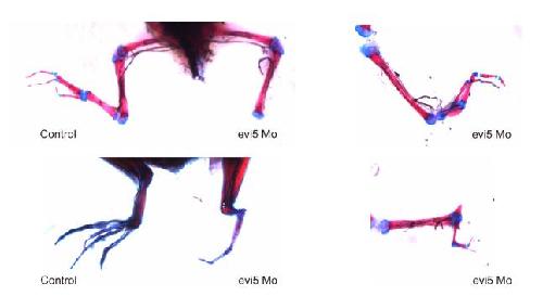 Figure S4. Skeletal preparation of Evi5 knockdown tadpoles. Shown are examples of skeletal staining of the hindlimbs of Xenopus froglets, 1 month after Evi5 knockdown at NF stage 52/53. While hindlimbs injected and electroporated with Control Mo regenerate 3-4 digits, hindlimbs with Evi5 knockdown regenerate fewer digits, forming 0 to 2 digits. Stage 52/53 tadpole hindlimbs were amputated through the knee level.