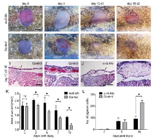 Figure S9. Effect of evi5 Mo on wound healing in the Xenopus skin punch model. (A-H) Skin punches performed in the hindlimb of the Xenopus froglets. (I, J) HE staining of the control and Mo groups at day 10. (I, J) Enlargements of the squared areas in (I) and (J), respectively. (K) Measurement of the area of punch. (L) Counting of the number of pigment cells in wounds. Scale bars represent 500 m in (A-H), 200 m in (I) and (J), and 50 m in (I) and (J). * indicates p < 0.05. One-way ANOVA, and multiple between-group t-test.Skin punches were performed with a 1 mm diameter biopsy punch (Acuderm Inc., USA).