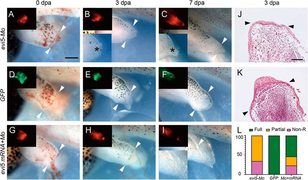 FIGURE 3. Xenopus tadpole limb regeneration after Evi5 knockdown. (AI) Stage 5253 tadpole hindlimbs at 0, 3 and 7 dpa, after injection/electroporation of evi5 Mo (AC), GFP DNA (DF), or evi5 mRNA + evi5 Mo (GI). Fluorescent images (insets) indicate site of injected materials. Bright field insets show enlarged views of the limb stump. Black * indicates the epithelium layer formed in evi5 Mo-injected tadpole limbs. White arrowheads indicate amputation levels. Scale bar: 0.5 mm. (J,K) HE staining of the evi5 Mo and GFP-injected 3 dpa limb regenerates, showing that blastema formation was defective in evi5 Mo-injected tadpole limb. Scale bar represents 0.2 mm. (L) Stacking graph of non-regenerative, partial regenerative and full regenerative tadpole limbs.