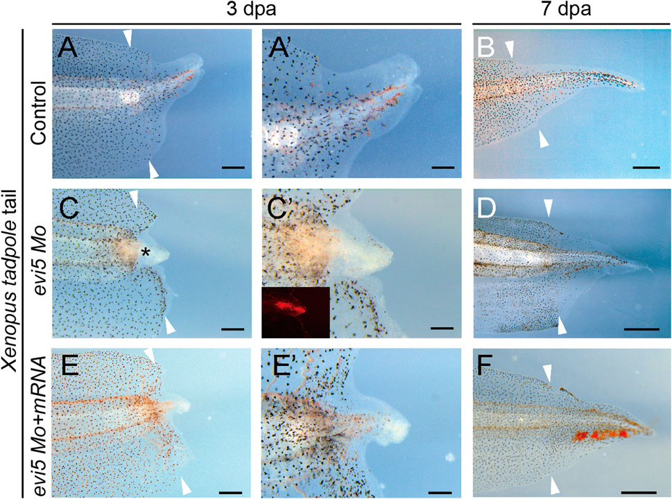 FIGURE 5. Tail regeneration in Xenopus tadpoles after evi5 Mo injection. (AB) Regenerating tadpole tail at 3 and 7 dpa in a control tadpole. (CD) Regeneration of the Mo-injected tail was delayed compared to controls. * marks the tail blastema region lacking pigment cells. (EF) Co-injection of evi5 Mo and evi5 mRNA partially rescued the inhibitory effect of evi5 Mo on tail regeneration. (A,C,E) High magnification images of tadpole tails at 3 dpa. Fluorescence signal in inset (C) indicates the delivery of Mo. Scale bars represent 500 m in (A,C,E), 200 m in (A,C,E), and 1 mm in (B,D,F).