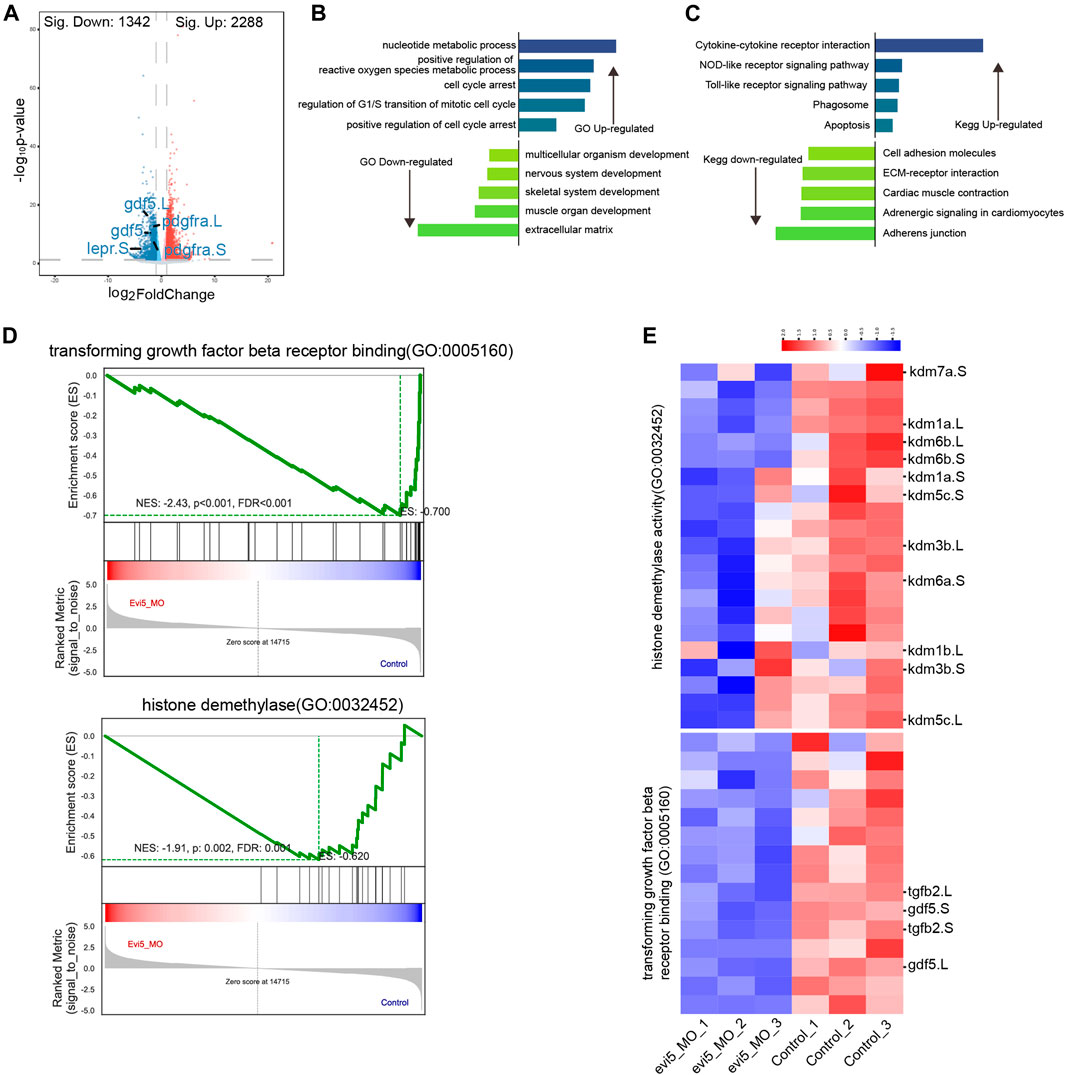 FIGURE 6. RNA-seq analysis of evi5 Mo-injected Xenopus tadpole limbs at 3 dpa. (A) Volcano plot showing differential genes after Evi5 knockdown, with significant down-regulation markers in blue, significant up-regulation markers in red, and no significant difference markers in gray (B) GO enrichment analysis of the biological processes enriched by up- and down-regulated genes, histogram representation - Log10 (p value). (C) KEGG pathway enrichment analysis of pathways enriched by up- and down-regulated genes, histogram representation - Log10 (p value). (D) Gene set enrichment analysis (GSEA) of genes enrichment in histone demethylase activity and transforming growth factor beta receptor binding gene ontology. (E) Heatmap analysis of gene set for GSEA.