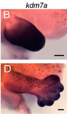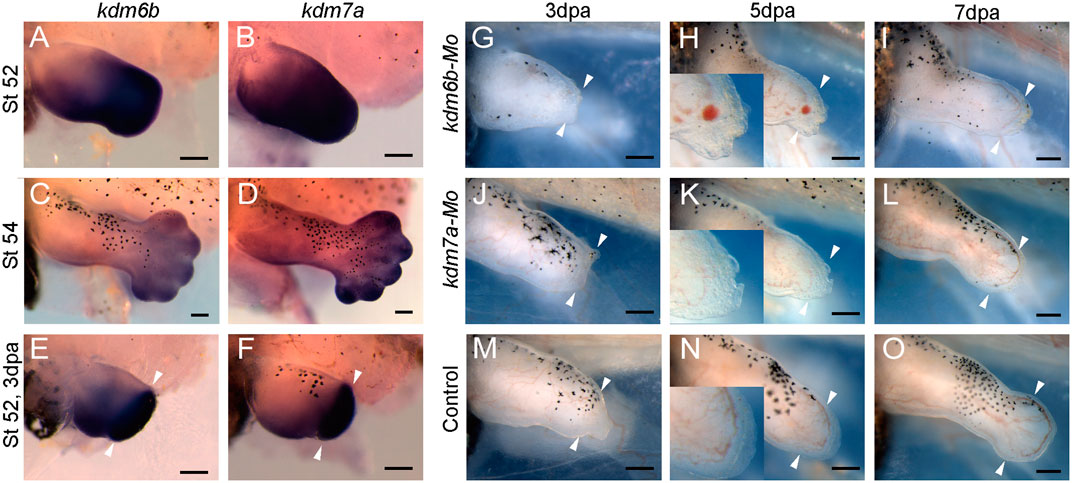 FIGURE 7. kdm6b and kdm7a in Xenopus tadpole hindlimb development and regeneration. (AF) Expression of kdm6b (A,C,E) and kdm7a (B,D,F) in NF stage 52 (A,B) and stage 54 (C,D) Xenopus tadpole hindlimb, and 3 dpa limb regenerates (amputated at stage 52) (E,F). (GO) Representative images of tadpole hindlimbs at 3 dpa (G,J,M), 5 dpa (H,K,N), 7 dpa (I,L,O) after injection/electroporation of kdm6b Mo (GI), kdm7a Mo (JL) or control Mo (MO). Images of tadpole limbs shown with dorsal up, anterior to the left. Scale bars represent 0.2 mm.