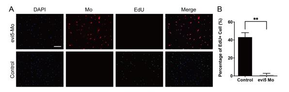 Figure S5. Proliferation of Xenopus tadpole limb blastema cells after evi5 knockdown. (A) Micrographs of Xenopus blastema cells, after EdU incorporation detection. Mo was indicated by red fluorescence. EdU shown in green. Nuclei were counterstained with DAPI, shown in blue. Scale bar represents 200 m. (B) EdUpositive cells/Mo-transfected cells. ** indicates significant difference, **p<0.01, n=6, t-test.