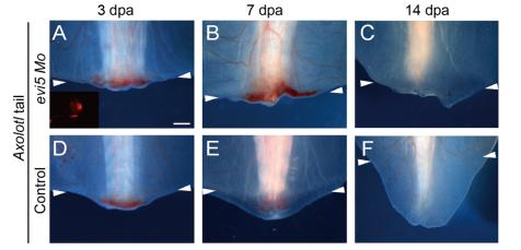 Figure S6. Axolotl tail regeneration after Evi5 knockdown. (A-C) Axolotl tail regeneration was inhibited by evi5 Mo-injection. (D-F) Axolotl tail regeneration occurred normally in controls. White arrowheads indicate amputation level. Scale bar: 1mm.