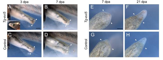 Figure S7. Overexpression of evi5 in transgenic tadpoles and post-metamorphic froglets. (A-D) Continuous induction of evi5 expression in transgenic tadpoles of NF stage 58 and observation of hind limb regeneration showed that systemic evi5 overexpression did not promote regeneration. (E-H) Overexpression of evi5 in postmetamorphic froglets did not facilitate limb regeneration. Scale bar: 500 μm.