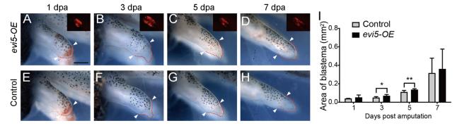 Figure S8. Overexpression of evi5 in the hind limbs of NF stage 54-55 tadpoles. (A-H) Injection of the evi5-2A plasmid into the hind limbs of tadpoles at NF stage 54-55 showed that evi5 overexpression promoted tissue growth but not enough to induce regeneration. (I) The area of the regenerated blastema was measured and analyzed for significance by t-test. Scale bar: 500 m. * indicates p < 0.05 and ** indicates p < 0.01.