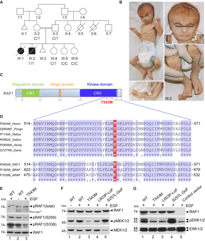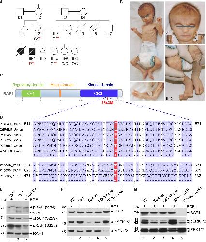 Figure 1. RAF1 germline homozygous missense mutation causes a neonatal lethal syndrome with progeroid features