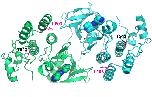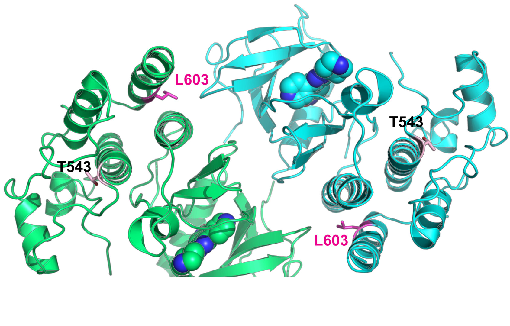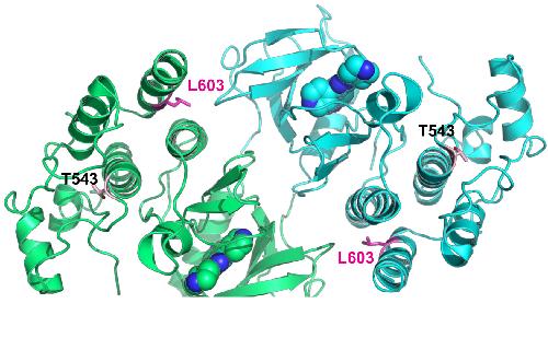 RAF1 homodimer (PDB:3OMV) showing the location of Thr543 (drawn as ball-and-stick) on helical subdomain. Active site is occupied by an inhibitor drawn as spheres.