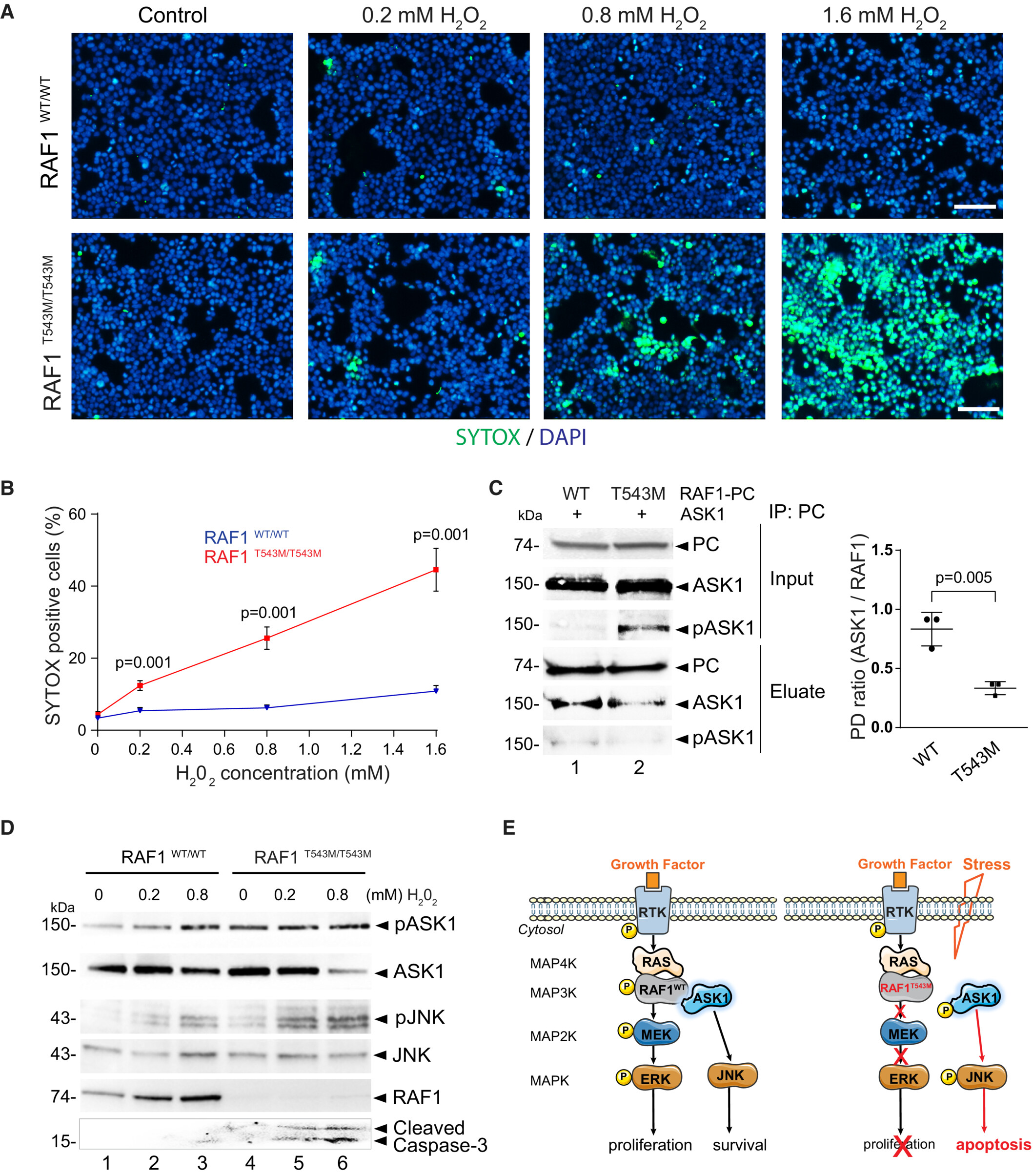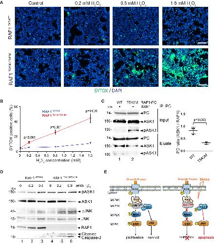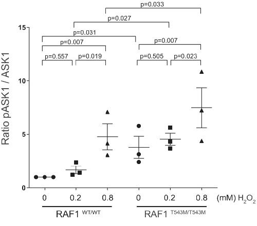 p.Thr543Met knock-in in 293T cells revealed that RAF1T543M is unstable and more sensitive to stress-induced apoptosis via ASK1 de-repression.