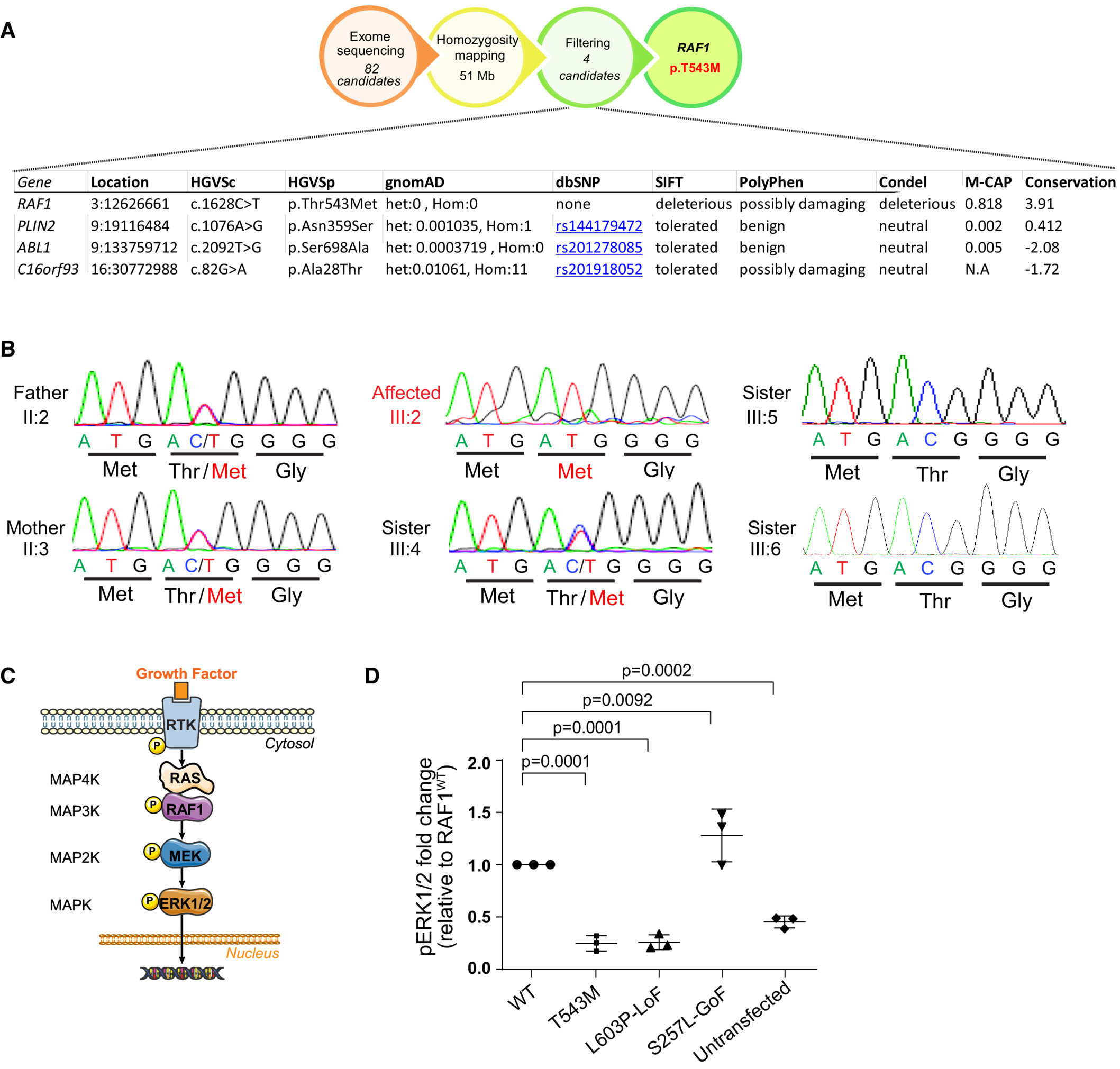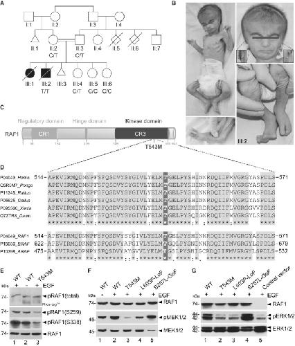 In cultured cells and in vivo using Xenopus assays the p.Thr543Met mutation behaved as a loss-of-function allele that abolishes downstream ERK pathway signaling in response to growth factor stimulation.