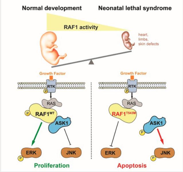 A novel recessive variant in RAF1 was identified as a possible cause of a hitherto unknown lethal neonatal syndrome with progeroid features. This private p.Thr543Met mutation abolished downstream ERK pathway signaling while increasing susceptibility to apoptosis via ASK1 de-repression.